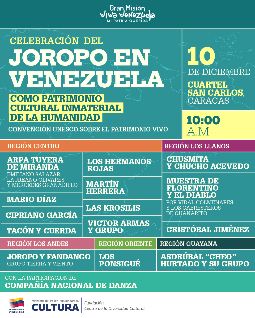 La gran fiesta conmemorativa se efectuará este miércoles 10 de diciembre en el Cuartel San Carlos a las 10:00 a.m., un acontecimiento en donde se celebrará la nominación del Joropo como Patrimonio Cultural Inmaterial de la Humanidad. Participarán portadores y portadoras de la tradición provenientes de distintas regiones del país.